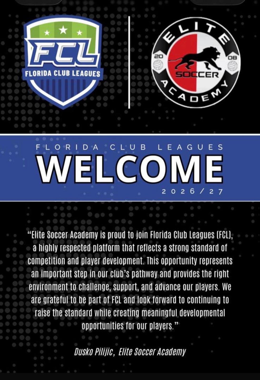 Elite Soccer Academy has officially been recognized and accepted into Florida Club Leagues (FCL) — a powerful step forward that reflects the quality, identity, and standards we have built together.