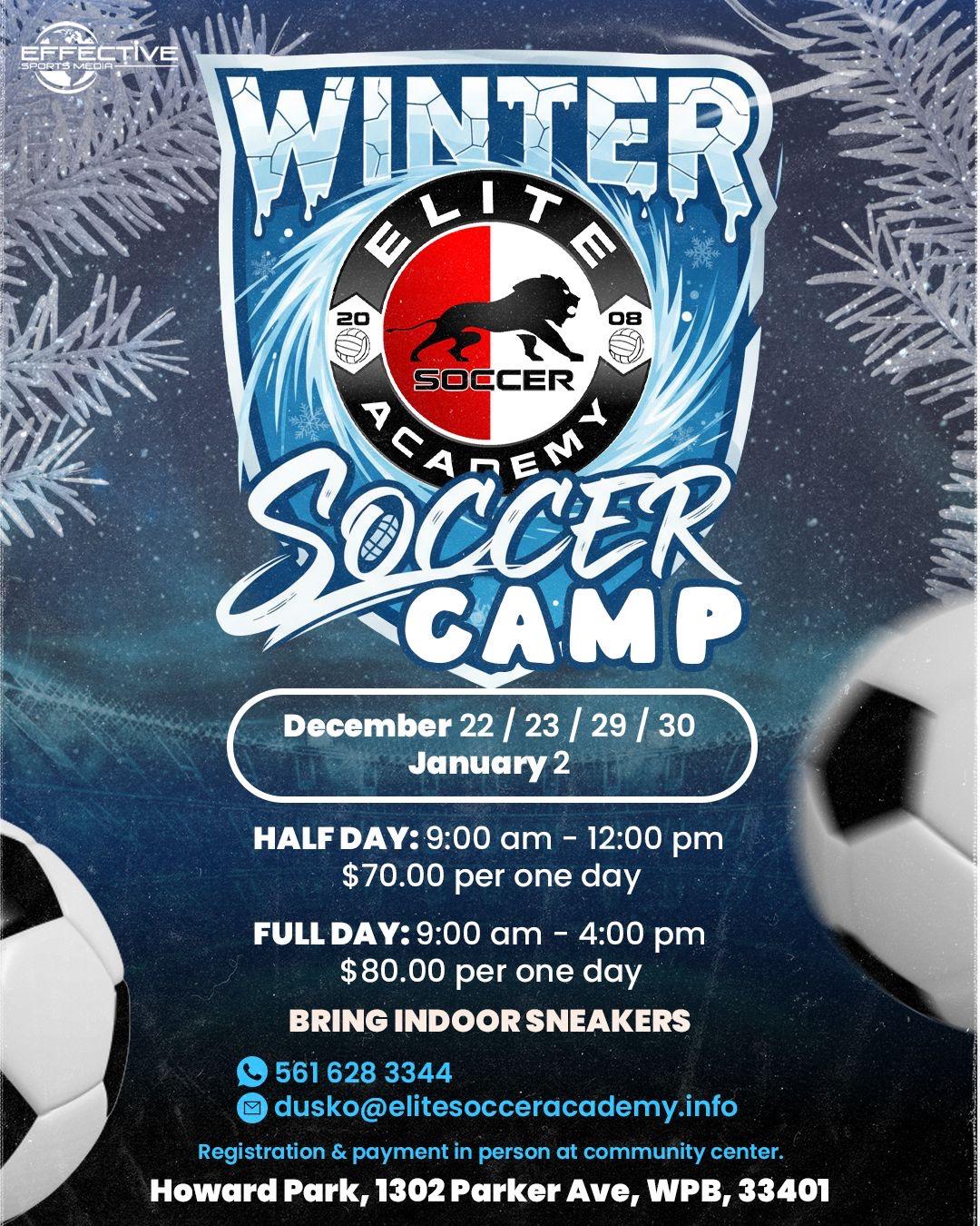 December 22/23/29/30 January 2 **🕛 Half Day: 9am - 12pm $70.00 per one day 🕓 Full Day: 9am - 4pm $80.00 per one day 📍 Howard Park, 1302 Parker Ave, WPB, 33401 ®️ Registration & payment in person at community center. 📲 561 628 3344 📧 dusko@elitesocceracademy.info Ball mastery & technical development is the main objective of the Winter Camp curriculum! WINTER CAMP is tailored for Competitive Soccer players ⚽
